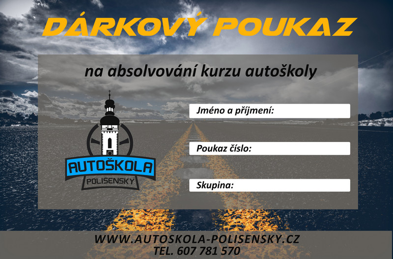 Přemýšlíte nad originálním dárkem pro své blízké? Darujte jim poukaz na řidičský průkaz. Níže naleznete grafickou podobu poukazu. V případě Vašeho zájmu nás neváhejte kontaktovat na tel. 607 781 570.